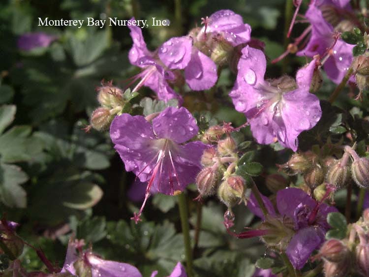 color as the famous ‘Johnson’s Blue’ but the flower is smaller, and the latter lacks the well defined petal veins. Overall it looks like a more deeply colored, slightly more gracile G. himalayense, but is reportedly a hybrid of G. pratense and G. clarkei ‘Kashmir Purple.’ This is a relatively recent hybrid, and a good one. It is showy, adaptable, and blooms a long time. The deeply cut, lacy leaves can reach 7" across on mature plants. rev 7/2004x cantabrigense CAMBRIDGE GERANIUM closeup habit an evergreen perennial in our area, at least partly so, but deciduous with much cold. This is a vigorous, dependable hybrid involving G. macrorrhizum, it has a similar pungent, resinous smell just like that species, but weaker. To 12" tall, a single plant will clump to 3’ wide but it travels and multiple plantings will quickly intergrow to form drifts or banks of foliage and flower color.. Small, dense, rounded dark green leaves are slightly cut, with an exceptionally shiny, lustrous quality. Burgundy and bright red tones develop on the leaves with colder weather. Flowers are a deep lavender or mauve pink, borne over much of the year beginning in late winter. Sun to part shade, average to little summer watering, frost hardy. It overwinters well in areas of mild winters but likes a little direct sun or it tends to get rather thin. Likes rich soil, summer watering. Frost hardy, Sunset all zones. rev 4/2003